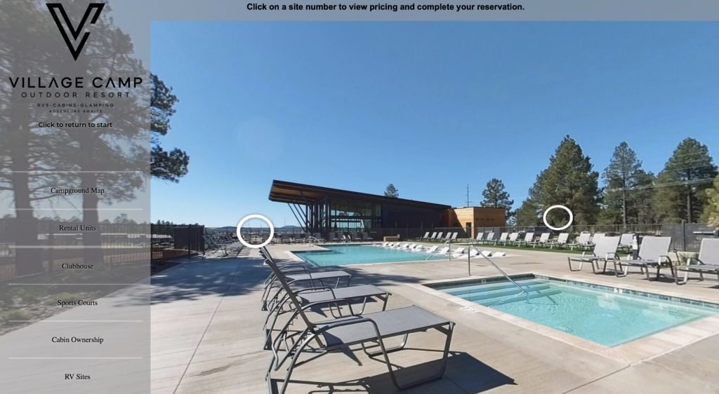 The resort uses CampSite 360 Interactive Booking, which allows guests to explore the campground and place their reservation directly inside the virtual tour.